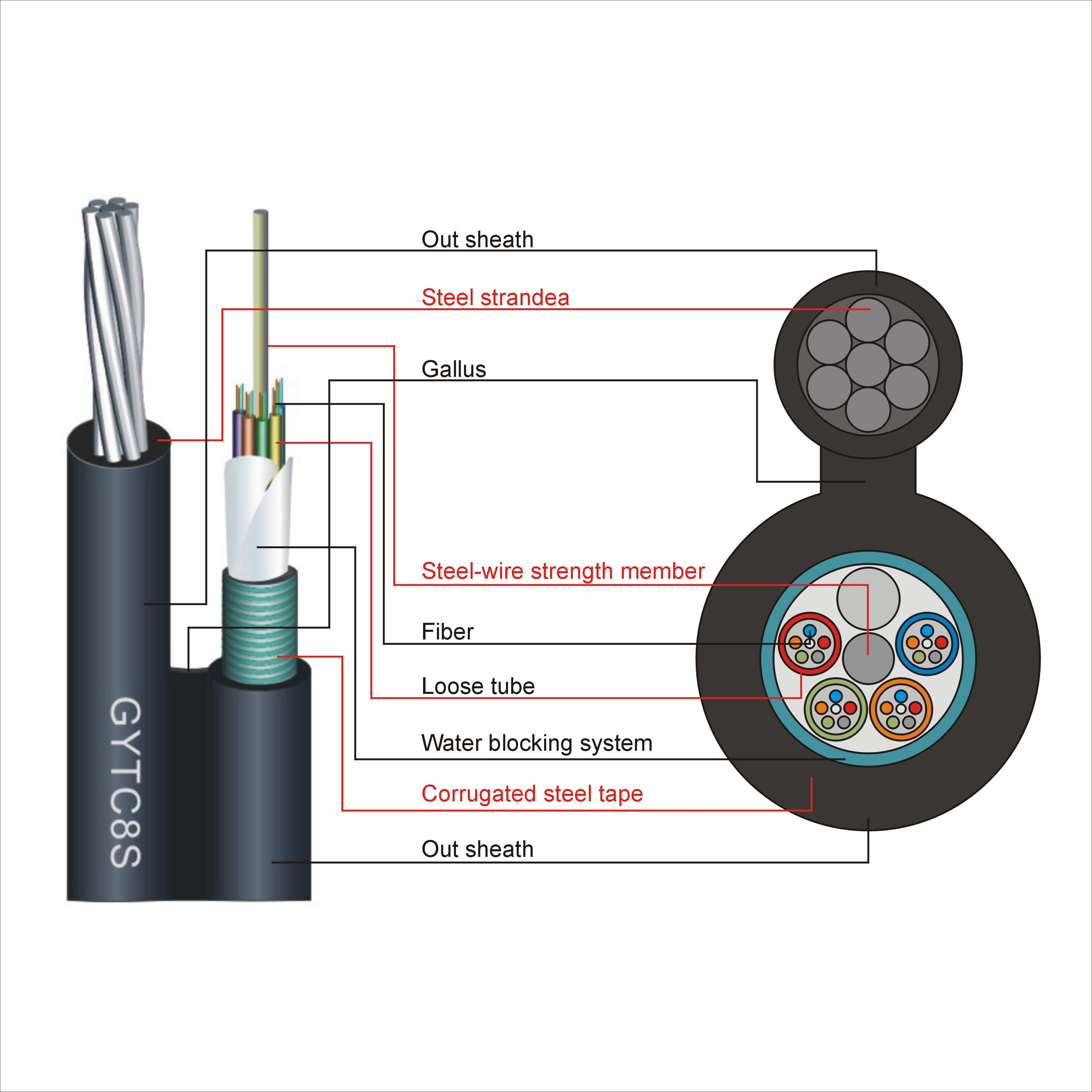 สายไฟเบอร์ออปติก8เส้น gytc8a gytc8s สำหรับใช้กลางแจ้งรองรับตัวเอง